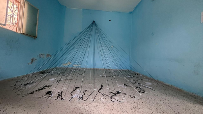 مريول: غرفة تملؤها خيوط الصوف المتدلية من الأعلى، بألوان المدرسة: الأخضر والأبيض. تمتد الخيوط كالأشعة، وتتقاطع، وتلتف، وتعيد تشكيل الفضاء. هل تربطنا هذه الخيوط أم تقيدنا؟ هل تمثّل ذكريات، أم أوامرَ، أم نماذج متكررة؟ هنا، لا تُعرض المدرسة كجدران ومقاعد، بل كإحساس يتدلى من السقف، يتكاثر، ويمتد داخلنا. يفتح العمل سؤالًا بسيطًا: كيف نرى المدرسة... حين لا نراها كما اعتدنا؟