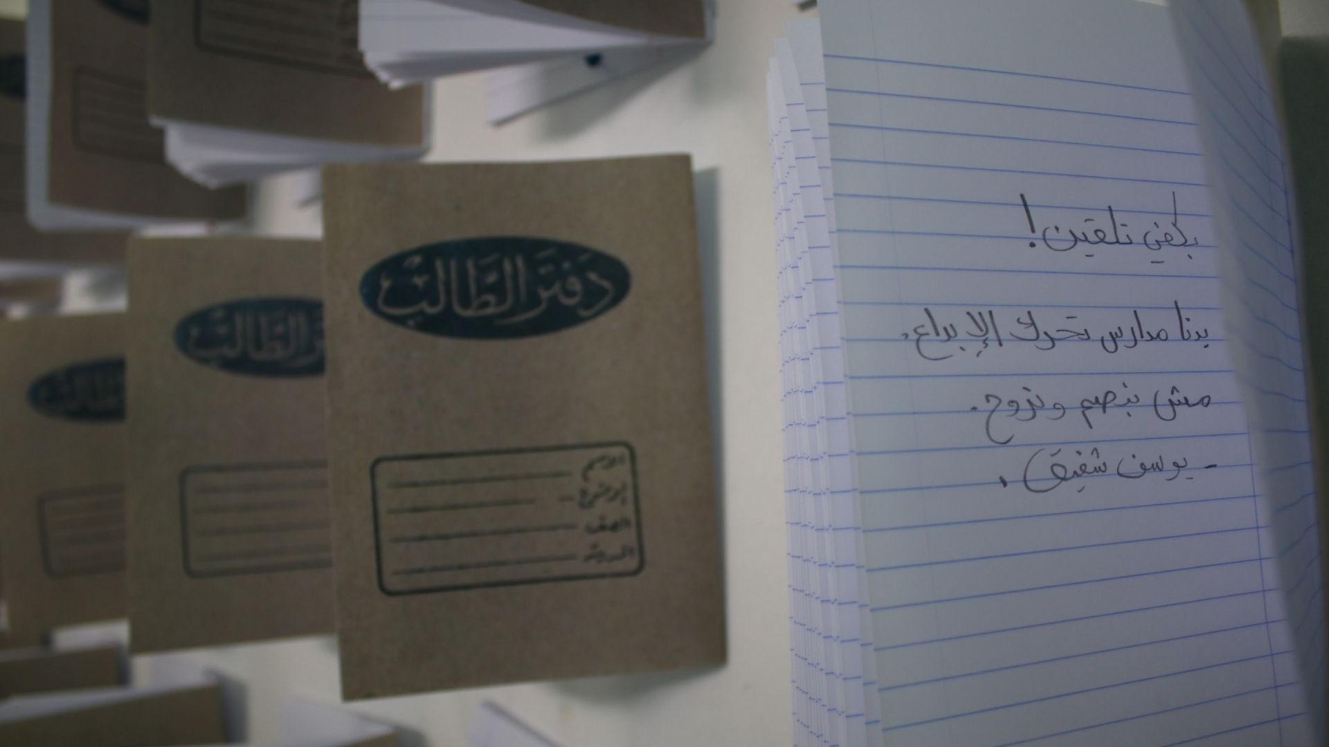 دفتر الطالب: حبل غسيل ودفاتر طلاب فارغة هي مصدر الإلهام لهذا العمل. فحبل الغسيل شاهد على أمهات يغسلن وينشرن ويرتبن الغسيل وحدهن، فتكون النتيجة: أم متعبة وأولاد مدللون يفتقدون مهارات أساسية في الحياة. "دفاتر طلابي الفارغة وأصواتهم الساكنة ذكّرتني كم أنا أم تبالغ كثيرًا في دورها على حساب راحتها وعلى حساب مهارات طلابها!".