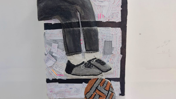 كرة خارج الإطار: تطرح هذه اللوحة تساؤلات حول النظام التعليمي التقليدي، الذي يُقيّد الطالب داخل إطار من الحفظ والتلقين، بعيدًا عن الإبداع والمهارات الحياتية. تمثّل الكرة في العمل أفكار الطالب وطموحاته التي تسعى للخروج من هذا الإطار الجامد، بينما تشير الورقة المطبوعة واللون الأسود الطاغي إلى سيطرة النظام التعليمي على فكر الطالب، مما يعيق فهمه الحقيقي وشغفه بالتعلّم. "هل ما نتعلّمه اليوم يُشكّل مَن نكون... أم يُقيّد مَن يمكن أن نكون؟".