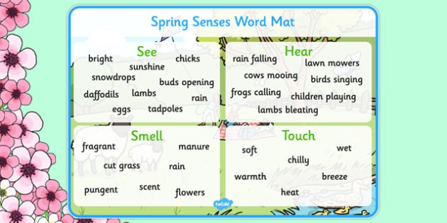 - تقدم الميسرة للطفل ورقة وتقسمها إلى أربعة أقسام، ويرسم في كل قسم منها عين وأذن وأنف ويد، ويقوم الطفل برسم وكتابة مظاهر الربيع المرئية والملموسة والمسموعة والروائح أيضاً.