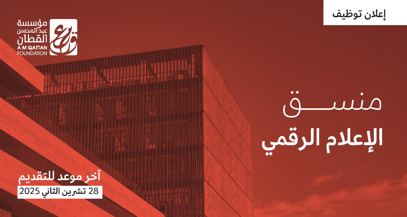 تعلن مؤسسة عبد المحسن القطَّان عن رغبتها في توظيف منسق الإعلام الرقمي ووسائل التواصل الاجتماعي في وحدة الاتصال، للعمل في مقر المؤسسة الرئيسي في رام الله، فيما يلي تفاصيل هذه الوظيفة: