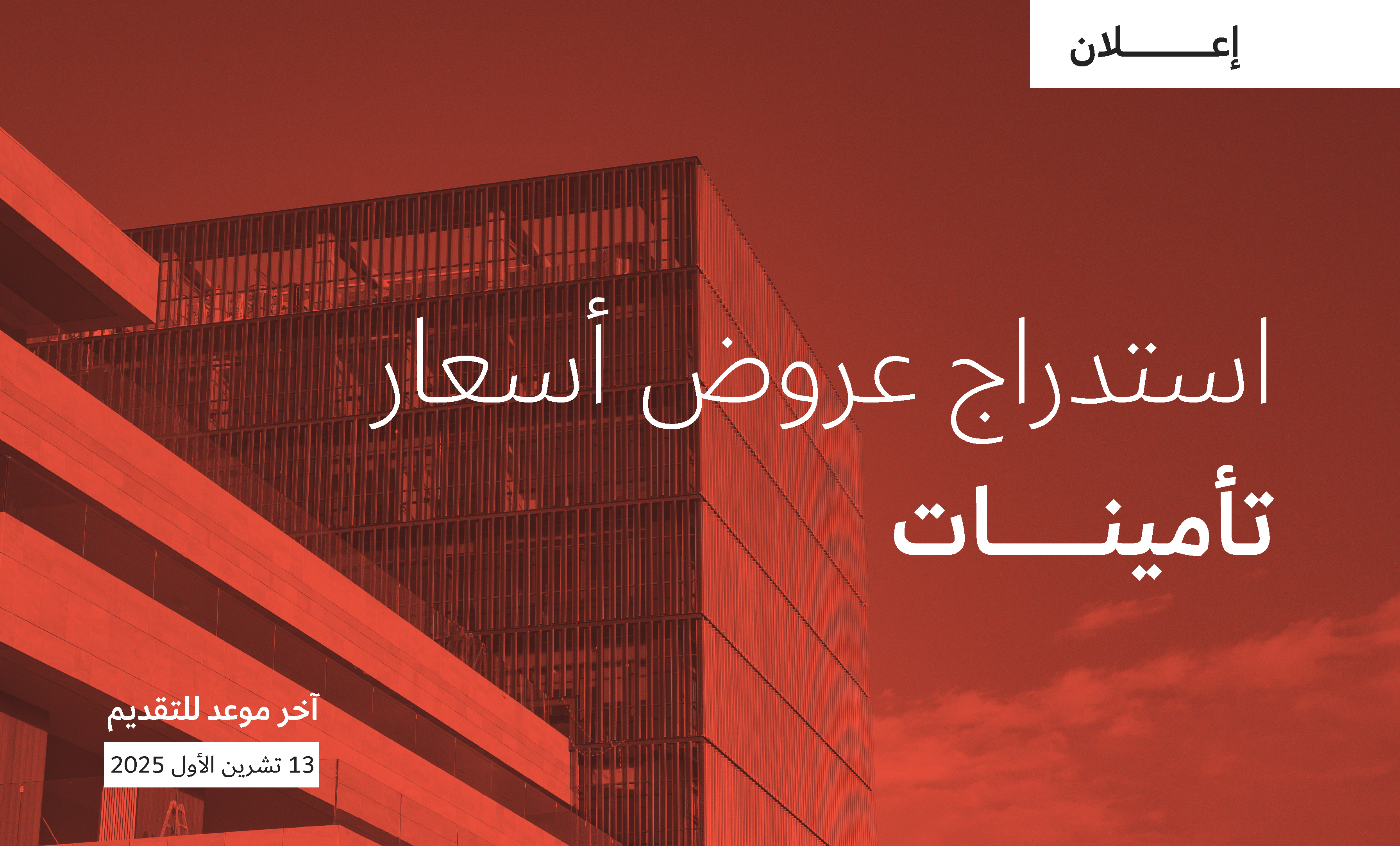 بالإشارة إلى الموضوع أعلاه، ترغب مؤسسة عبد المحسن القطان في استدراج عروض أسعار لتأمين ممتلكاتها ومركباتها في الضفة الغربية إضافةً لتأمين موظفيها في الضفة الغربية وغزة للسنوات الثلاث القادمة، ابتداءً من 1/1/2026، مع الأخذ بالاعتبار الشروط الإضافية الموضحة لكل نوع تأمين، التي تشكل الحد الأدنى للتغطيات، وعلى الشركات ذكر أية تغطيات إضافية في بند منفصل في عرض السعر المقدم من قبلها.