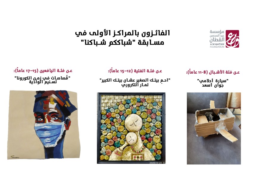 أعلنت مؤسسة عبد المحسن القطان في 14 أيار/مايو 2020، عن نتائج المسابقة الفنية "شباككم شباكنا" للأطفال من 8-17 عاماً في فلسطين؛ التي أطلقتها المؤسسة في 16 نيسان/أبريل 2020.
