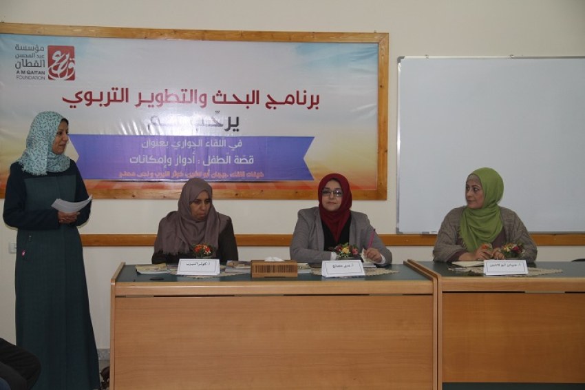 نظّم برنامج البحث والتطوير التربويّ/مؤسسة عبد المحسن القطّان، في غزة، الثلاثاء 13/12/2016، لقاءً حوارياً بعنوان "قصّة الطفل: أدوارٌ وإمكانات"، وذلك مع الحكّاءة جيهان أبو لاشين، والكاتبة كوثر النيرب، والفنانة المختصّة برسومات قصص الأطفال ندى مصلح.