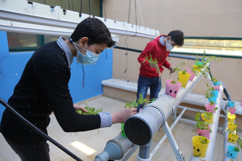شارك الطفلان عمر الحداد ومحمد الحناوي؛ العضوان في نادي القطان للعلوم، في تشتيل المزرعة المائية في الفناء الداخلي بمركز الطفل-غزة/مؤسسة عبد المحسن القطان.