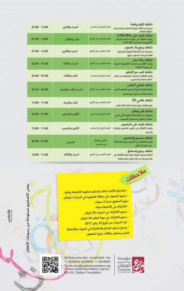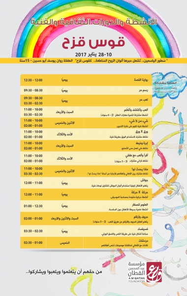 تنطلق في مركز الطفل-غزة مؤسسة عبد المحسن القطان فعاليات شتاء 2017، بعنوان "قوس قزح"، الحافلة بالأنشطة والدورات والبرامج الثقافية والفنية والعلمية والتكنولوجية للأهالي والأطفال خلال الإجازة الشتوية.