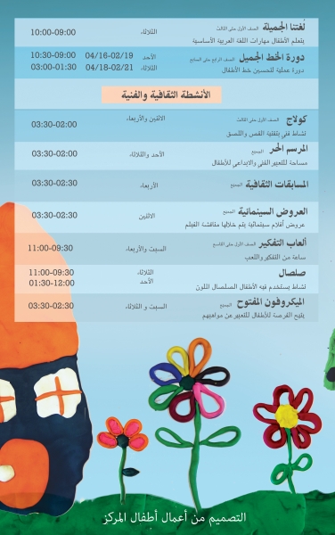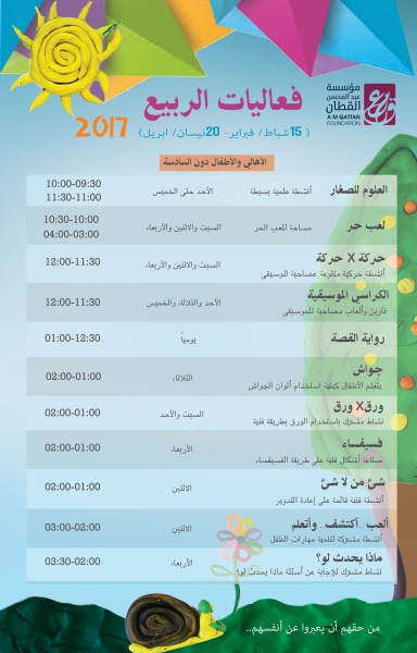 يطلق مركز الطفل-غزة/ مؤسسة عبد المحسن القطان، باقة متنوعة من الأنشطة والدورات والبرامج الثقافية والفنية والعلمية والتكنولوجية للأطفال، بالإضافة إلى أنشطة الأهالي والأطفال دون سن السادسة ضمن فعاليات ربيع 2017.