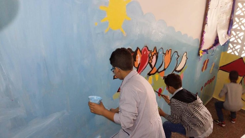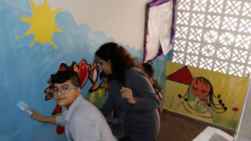 وقد تعاون الطلاب في المدرسة في تنفيذ الجداريات مع مدرّستهم.