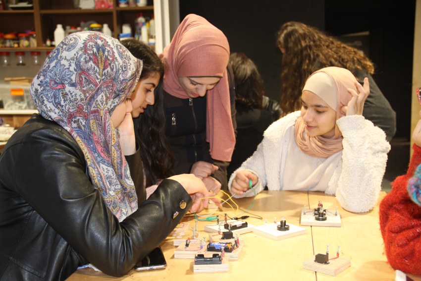 في يوم إجازتهم، السبت، اجتمعَ عشرون طالباً وطالبة من المدرسة الإنجليزية الحديثة لبناء داراتٍ كهربائية في استديو العلوم، إذ نفَّذت المعلّمتان ميساء اكميل، وفداء حرفوش هذه الورشة، ووظّفتا الاستوديو كمساحةٍ للتجريب والاستكشاف مع الطلبة.