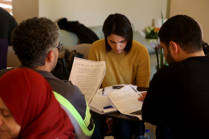 في قاعة مجاورة، في منتجع القرية السياحية في أريحا، حيث جرت المساقات، عمل باحثو البرنامج على تعريف وتمكين مربيّات الطفولة المبكّرة، المنخرطات في برنامج التكون المهني لمربيات الطفولة، من منهجيات تعليمية قائمة على القصة والدراما وعباءة الخبير.