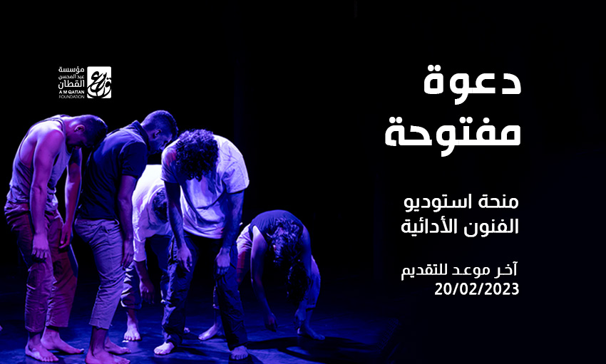 تعلن مؤسسة عبد المحسن القطان عن فتح باب التقدم للحصول على منحة استوديو الفنون الأدائية في دورتها الثانية للعام 2023، التي تتيح المؤسسة بموجبها استخدام استوديو الفنون الأدائية، لصالح تطوير و/أو إنتاج عمل أدائي جديد تقوم عليه فرقة/مجموعة/جهة فنية، وذلك لفترة تتراوح ما بين شهر إلى شهرين، خلال الفترة ما بين 1 نيسان وحتى 31 آب 2023، تبعاً لحاجات المشروع الفني المقترح، اضافة إلى تقديم دعم مالي جزئي للمساهمة في تغطية مصاريف أساسية ذات صلة مباشرة بالإنتاج والمعيشة أثناء فترة الإقامة، مساهمة منها في دعم الفنانين والفرق الفنية، من أجل تطوير مشاريعهم الفنية الجديدة و/أو تحققها.