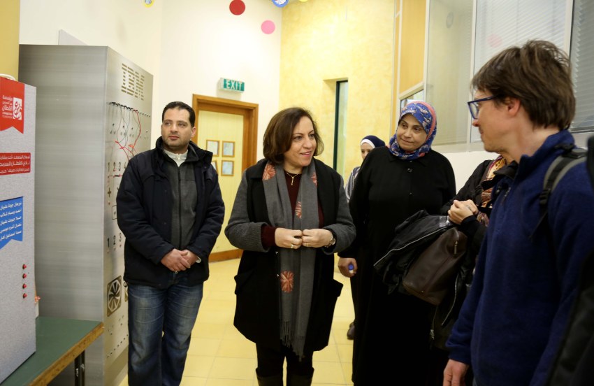 The delegation included Fabienne Arnould, Director of TdH Palestine, Dr. Khitam Hamad, TdH Gaza Office Manager, Jean-Michel Molenaar, Director of Swiss Fab Lab, and Yousef al-Yaziji, Director Fab Lab in the Gaza Strip.