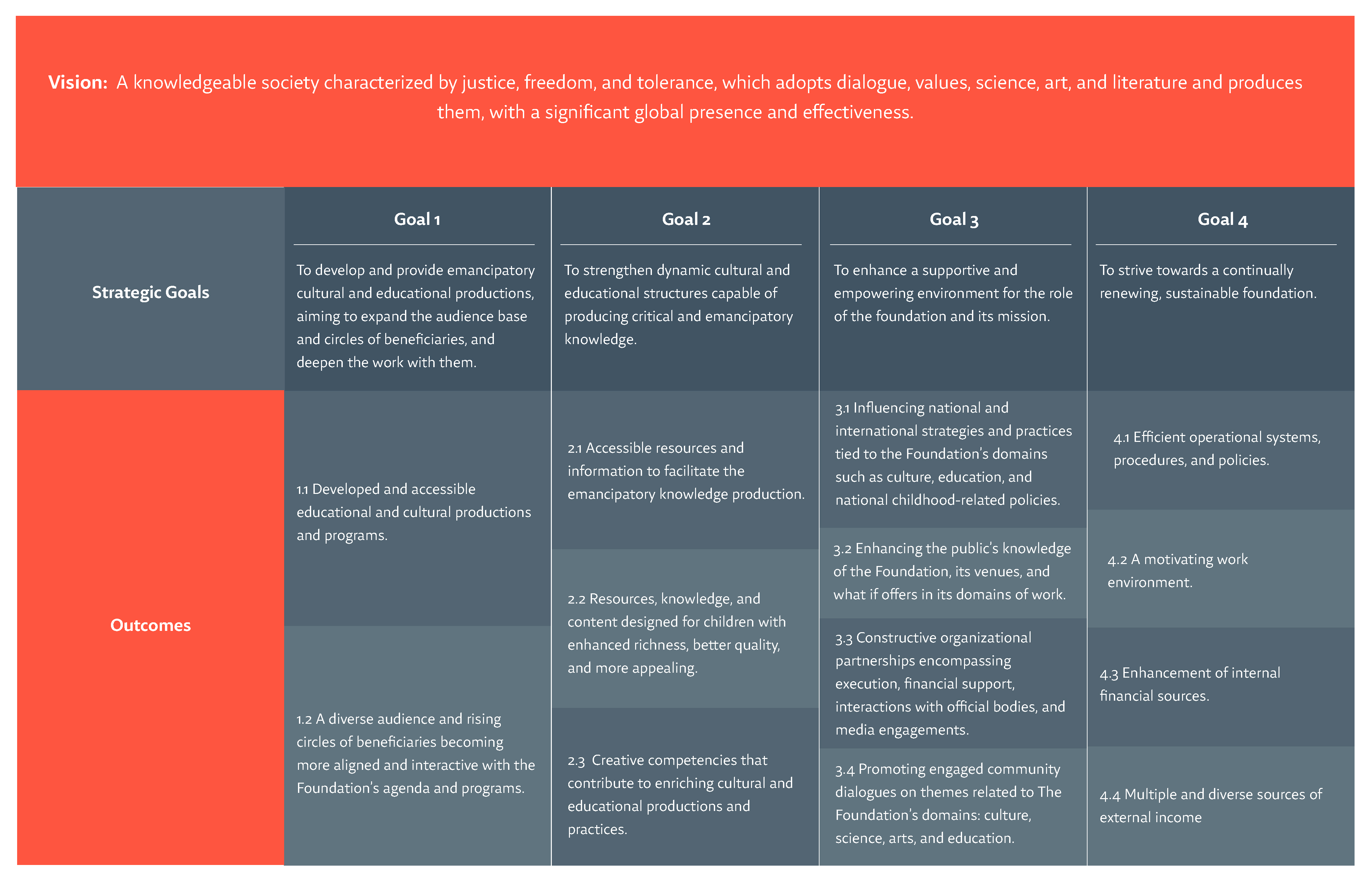 Our vision is of a society characterized by justice, freedom, and tolerance, where dialogue thrives, and science, art, and literature are revered, created, and wield global influence.