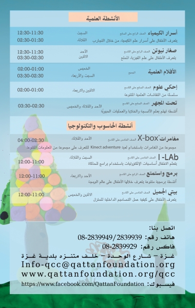 يطلق مركز الطفل-غزة/ مؤسسة عبد المحسن القطان، باقة متنوعة من الأنشطة والدورات والبرامج الثقافية والفنية والعلمية والتكنولوجية للأطفال، بالإضافة إلى أنشطة الأهالي والأطفال دون سن السادسة ضمن فعاليات ربيع 2017.