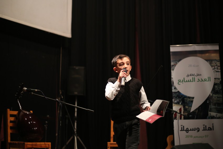 شارك الطفل حيدر الغزالي (12 عاماً)، من نادي بيت الأدب بمركز الطفل – غزة/مؤسسة عبد المحسن القطان، الأربعاء 7 كانون الأول 2016، في احتفالية أدبية ثقافية، نظمتها "مجلة 28" لمناسبة إطلاق عددها السابع.