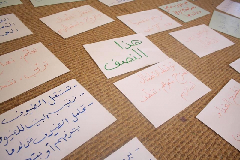 خمسون فعلاً وأكثر؛ سردتها النساءُ المشاركات في ورشةٍ بعنوان "نحن النصف"؛ ليصفنَ روتين حياتهنّ اليوميّ، وتصاعدت أصواتهنّ كلّما اكتشفنَ تشابهاً في نمط أيّامهنّ، وعظمة الجهد والإبداع المبذوليْن يوميّاً من أجل "ترتيب ساحة المعركة"، أو "جمع شظايا القنبلة" حسب وصفهنّ لمنازلهنّ بعد خروج أفراد العائلة وقبل انطلاق بعضهنّ إلى العمل؛ ليتمكنّ من إعادة إنتاج البيت كلوحةٍ فنيّة.