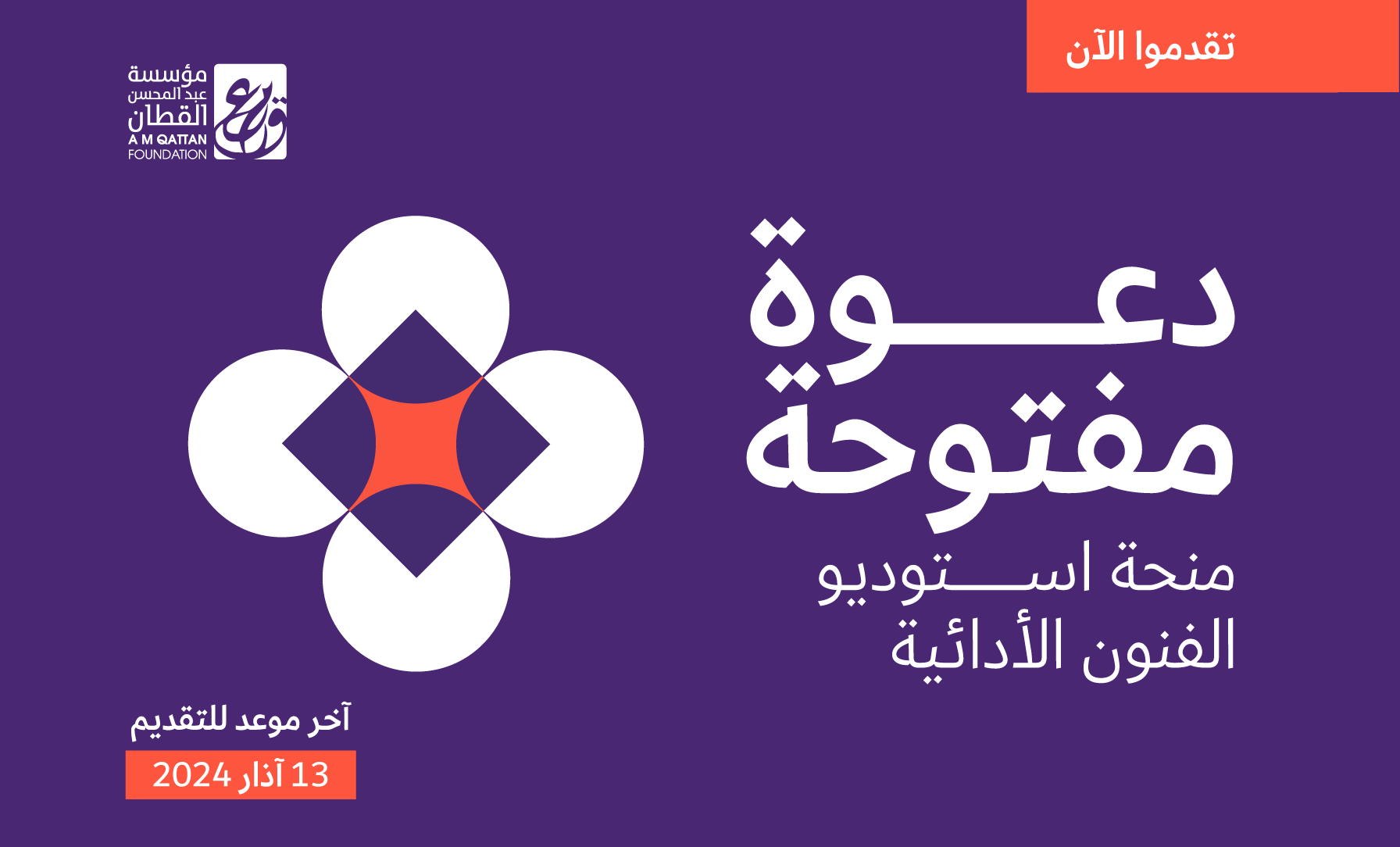 تعلن مؤسسة عبد المحسن القطان عن فتح باب التقدم للحصول على منحة استوديو الفنون الأدائية في دورتها الأولى للعام 2024، التي تتيح المؤسسة بموجبها استخدام استوديو الفنون الأدائية، لصالح تطوير و/أو إنتاج عمل أدائي جديد تقوم عليه فرقة/مجموعة/جهة فنية، وذلك لفترة تتراوح ما بين شهر إلى شهرين، خلال الفترة ما بين بداية نيسان ونهاية كانون الأول 2024، تبعاً لحاجات المشروع الفني المقترح، إضافة إلى تقديم دعم مالي جزئي للمساهمة في تغطية مصاريف أساسية ذات صلة مباشرة بالإنتاج والمعيشة أثناء فترة الإقامة، مساهمة منها في دعم الفنانين والفرق الفنية، من أجل تطوير مشاريعهم الفنية الجديدة و/أو تحققها.