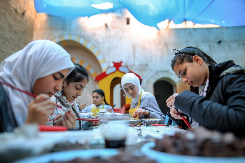 Over two months, the students and their teacher were involved in a training workshop organised by the Educational Research and Development Programme, in collaboration with Iwan Centre for Architectural Heritage and architect Nashwa al-Ramlawi. During the workshops, students learned the steps of how to make mosaic starting with kneading raw materials, cutting, arranging them in artistic patterns and finally casting them in their final form.
